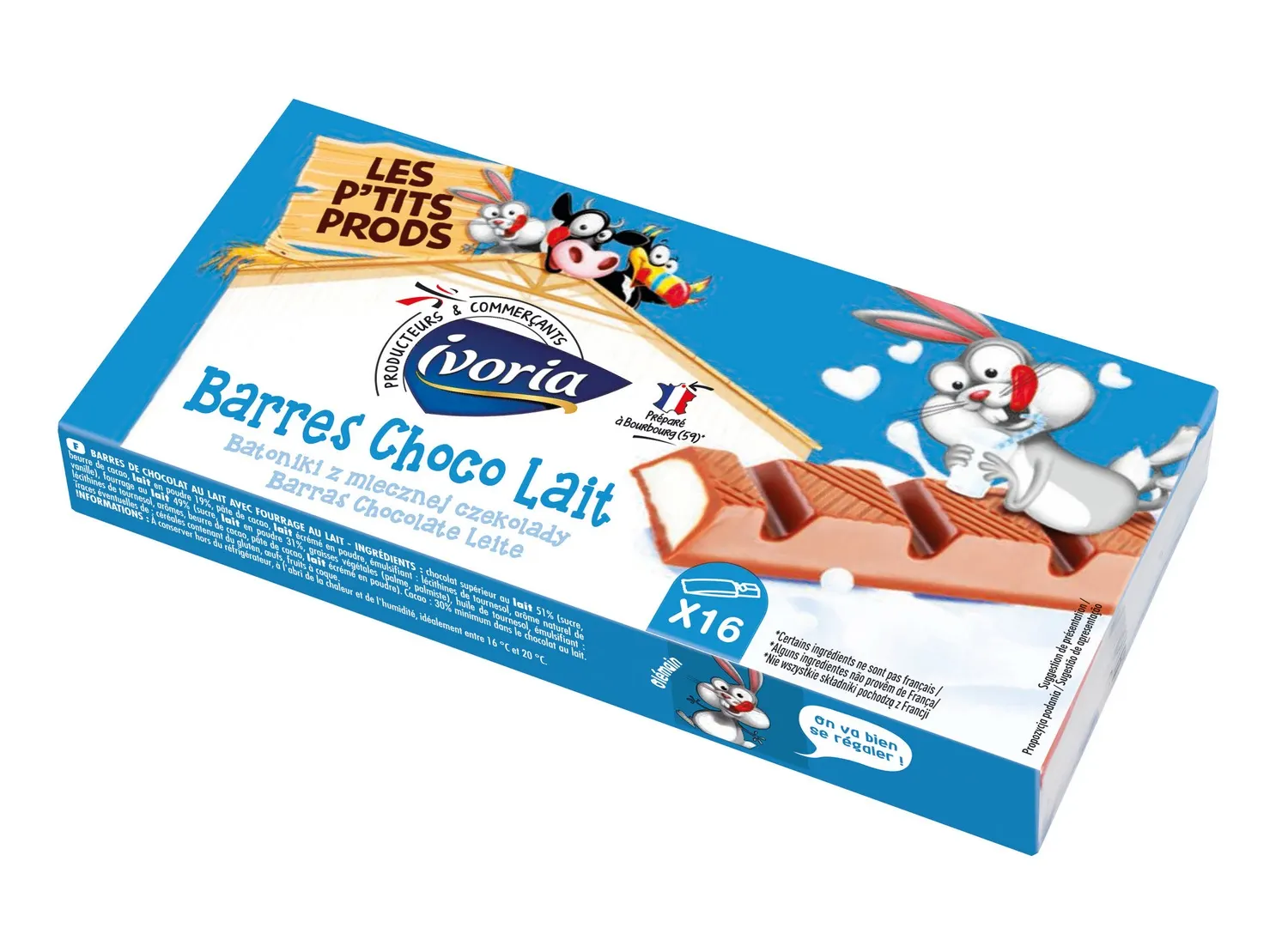 Barres chocolat au lait fourrée lait P’tits Prods 200g – IVORIA